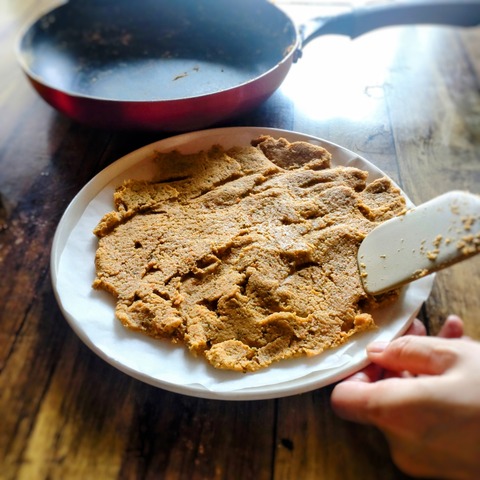 ④ある程度固まったら、クッキングペーパーをしいた天板にのせてオーブンで焼く。