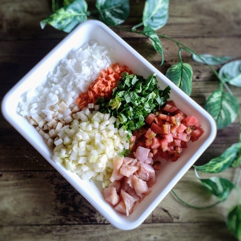 ①野菜、鶏肉、ニンニクをミキサーにかけやすいよう、みじん切りにする。