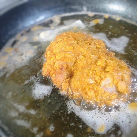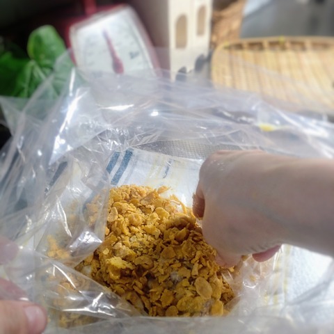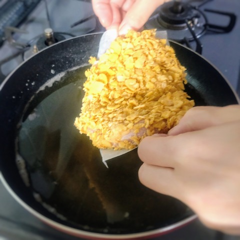 (コーンフレークの衣がつくと、ビックリするくらいサイズが大きくなる💦)