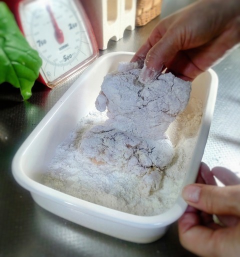 ②鶏肉に薄力粉をまぶし、余分な粉を落とす。