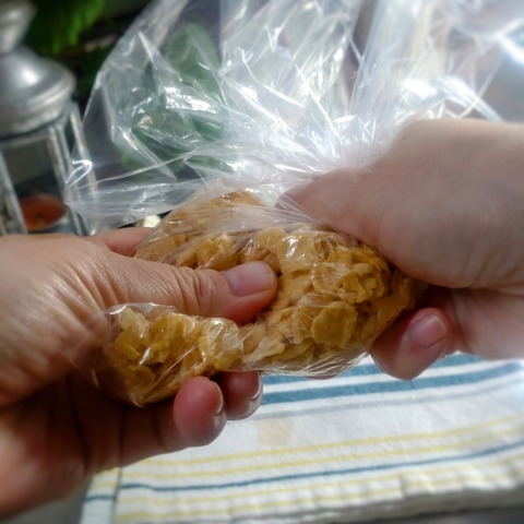 ・コーンフレークを袋に入れて、手やめん棒で砕く。