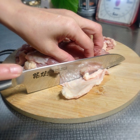 ・鶏肉の余分な皮を取り半分に切る。