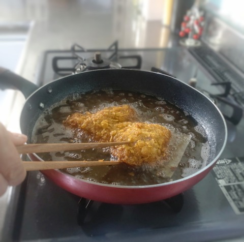 クッキングペーパーを敷いて揚げると、コーンフレークがはがれにくいです。