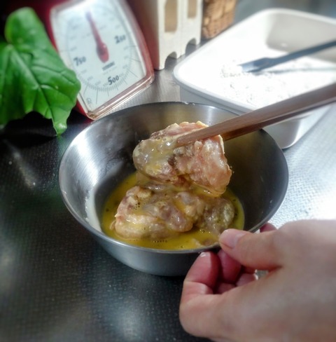 ③鶏肉を卵液(卵1/2個と水大さじ1と1/2)にくぐらせる。