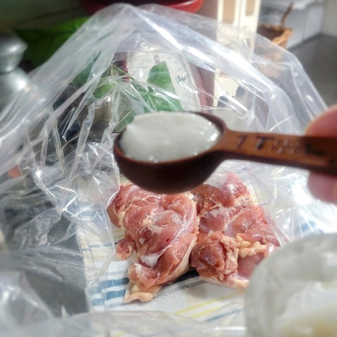 この時も鶏肉の下味に塩麹を揉み込みました。